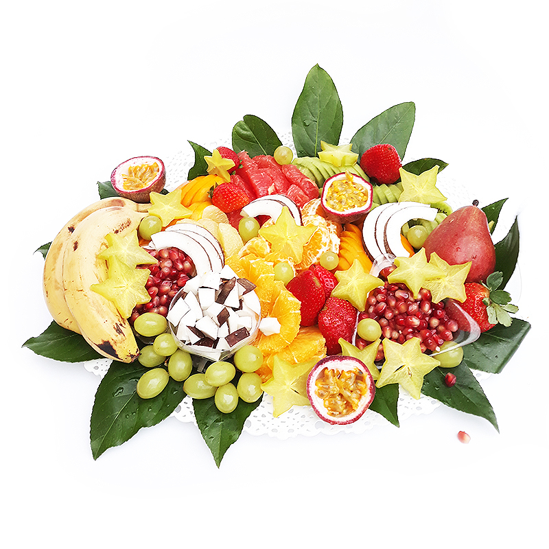 מגש פירות דיקורטיבי מפירות העונה. נחתך במקום מפירות טריים.