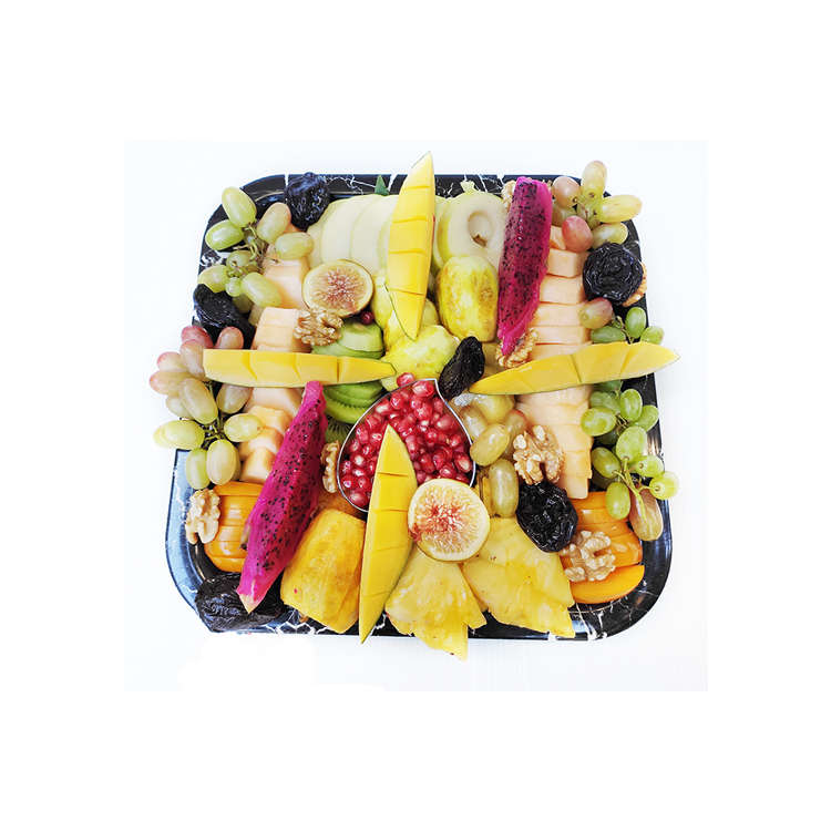 מגש פירות דיקורטיבי מפירות העונה. נחתך במקום מפירות טריים. גודל המגש: 25X25 ס"מ