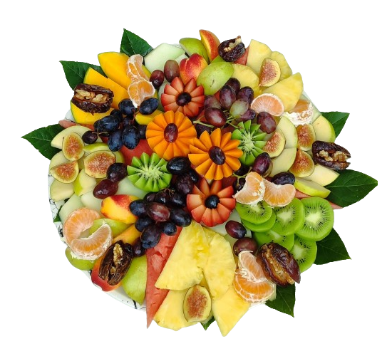 מגש פירות דקורטיבי מפירות העונה. נחתך במקום מפירות טריים.